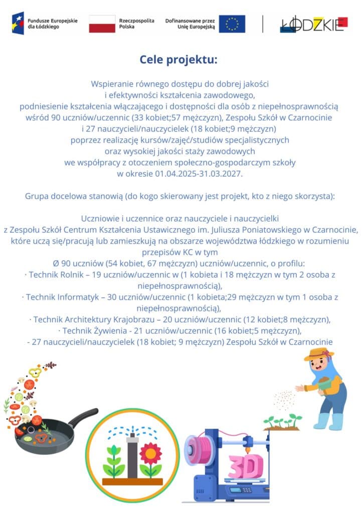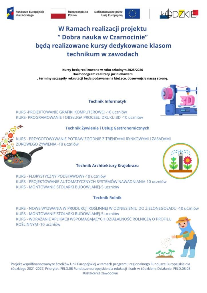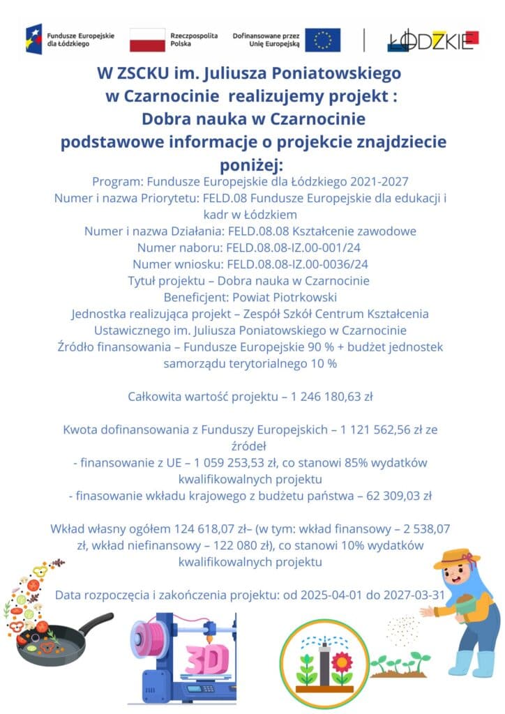 Zespół Szkół Centrum Kształcenia Ustawicznego im. Juliusza Poniatowskiego w Czarnocinie rozpoczął realizację projektu pn. „Dobra nauka w Czarnocinie”, współfinansowanego ze środków Unii Europejskiej w ramach programu Fundusze Europejskie dla Łódzkiego 2021–2027.