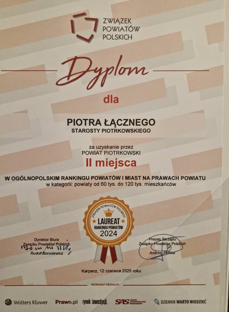 Podczas 32. Zgromadzenia Ogólnego Związku Powiatów Polskich, które odbyło się w Karpaczu, Powiat Piotrkowski ponownie stanął na podium w Ogólnopolskim Rankingu Powiatów. Drugie miejsce w kategorii powiatów do 120 tysięcy mieszkańców za 2024 rok odebrał Starosta Piotr Łączny, potwierdzając po raz kolejny, że nasz samorząd należy do ścisłej czołówki w kraju.